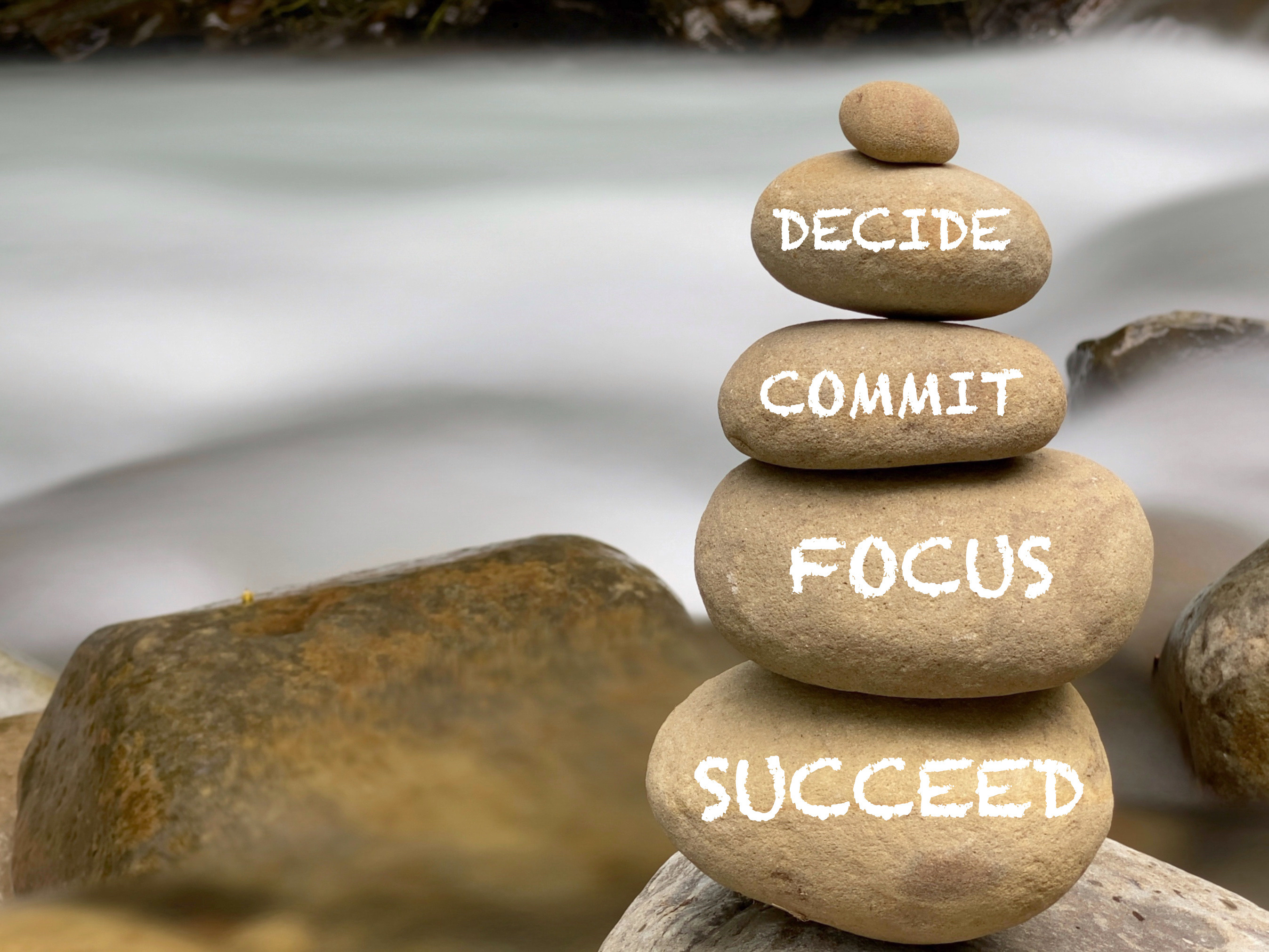 Inspirational and motivational words of decide commit focus succeed on stones with vintage background.